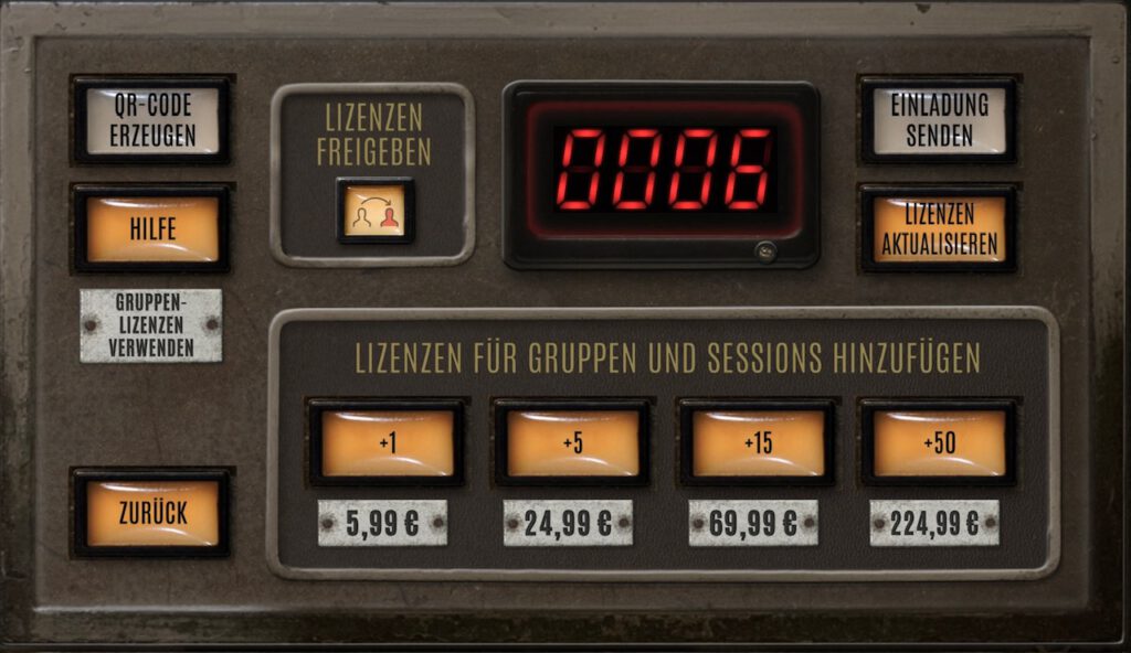 In Escape the BOOM!, enter the group licenses menu by pressing the coin slot and then tapping on “GROUP LICENSES” (or its local translation). In this screen, you can see the number of licenses that are already purchased and still available. You can add license packages of 1, 5, 15 and 50 licenses to this contingent, with a higher discount the larger the package you choose.